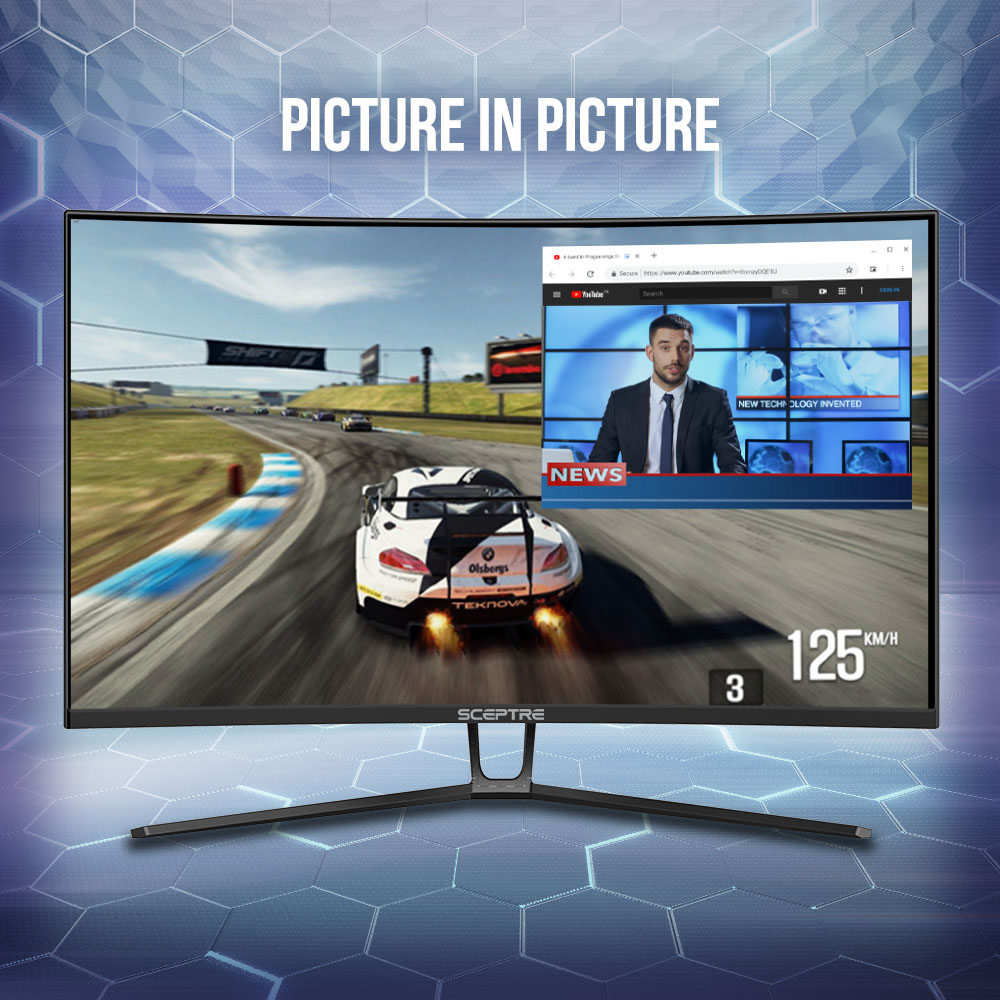 Picture In Picture allows our users to multitask and overlay a secondary source to display anything you desire. Expand your workflow with our Sceptre Gaming monitor.