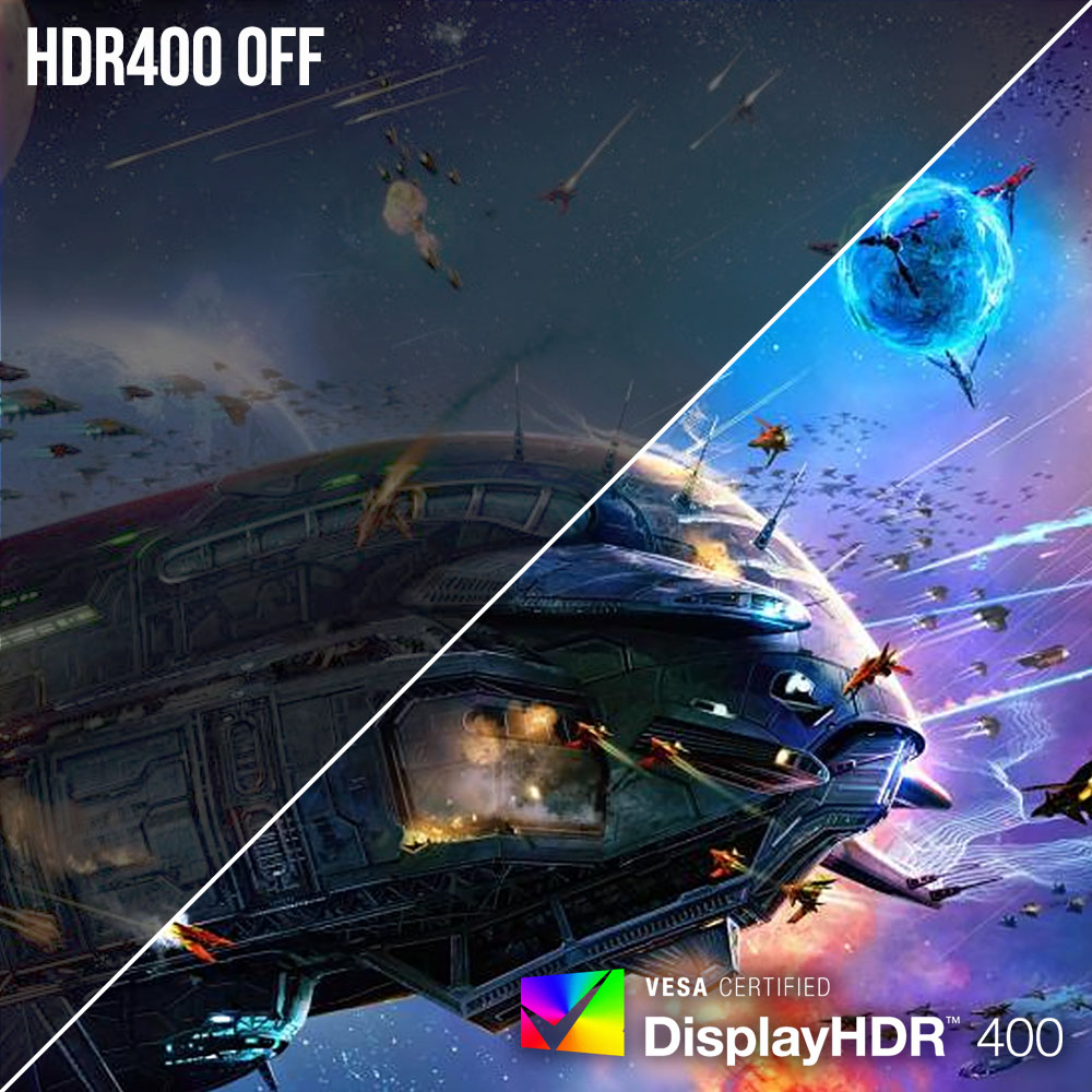 HDR400 (High Dynamic Range) enhances dynamic contrast ratio, illuminating colors up to 50% brighter than SDR while displaying profoundly clear dark colors.